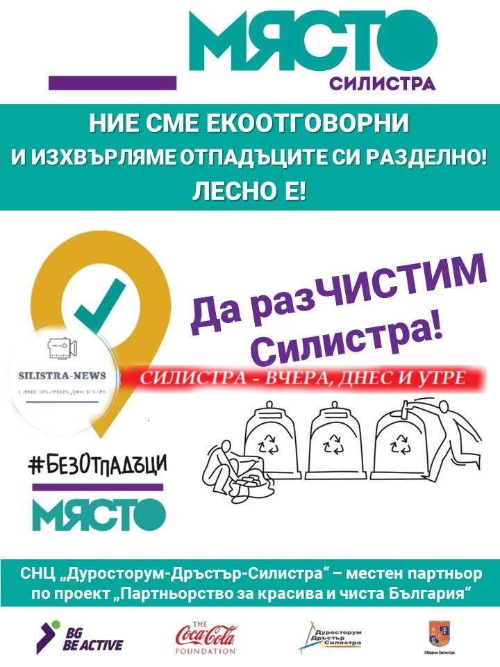 Към каузата #БезОтпадъци се присъединиха и част от заведенията в град Силистра. Екипът на СНЦ „Дуросторум-Дръстър-Силистра“ предостави безвъзмездно за ползване 120 литрови кошове за разделно събиране на пластмаса на ресторанти и барове, в чиято ежедневна дейност се генерира пластмасов отпадък. Така, събраната пластмаса ще попадне на правилното място – в големите жълти контейнери и ще продължи пътя си към рециклирането.