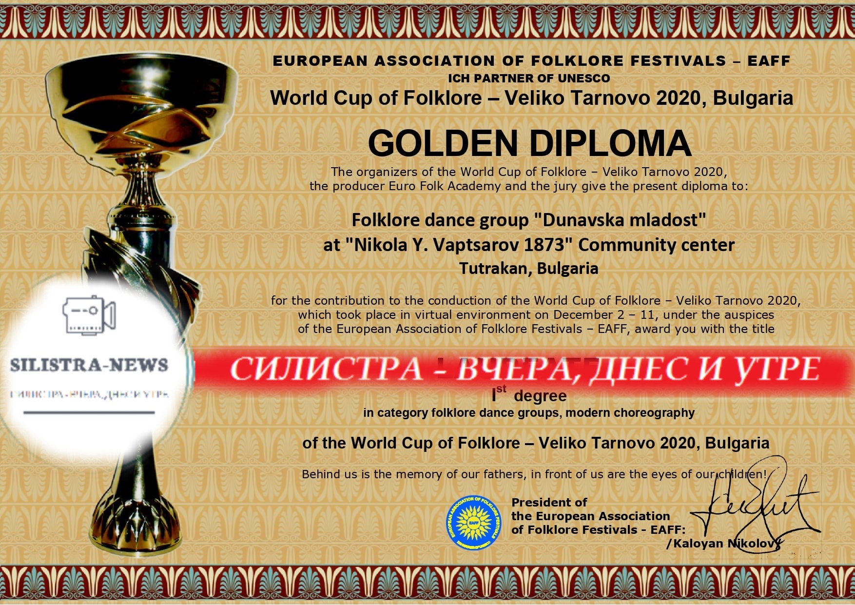 След оценката на престижно жури двете формации на „Дунавска младост” имат и награда „Златна диплома“ – лауреат I степен, плюс препоръка за V-ата Световна купа по фолклор – Велико Търново 2021 и 10 % отстъпка от таксата за участие в проявата.