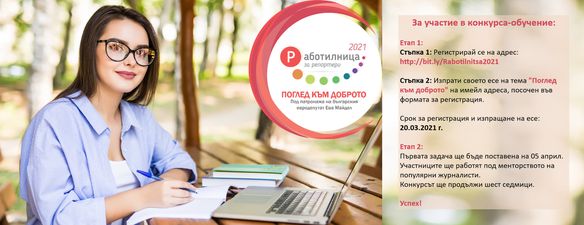 Тазгодишната тема на проекта е „Поглед към доброто“. Конкурсът ще се провежда на национално ниво и ще бъде на два етапа.“Поглед към доброто“ е темата на шестото издание на онлайн ученическия конкурс-обучение за журналисти „Работилница за репортери“, който поради засилен интерес на ученици от цялата страна, официално разширява обхвата си на национално ниво.Кариерно ориентиране, досег до журналистическата професия и ценни насоки и менторство от популярни журналисти и специалисти в сферата, ще могат да получат ученици от 9. до 12. клас, от училища от цяла България.Тази година конкурсът-обучение за първи път ще се провежда на два етапа. Желаещите да предизвикат себе си и да покажат своя талант пред широка публика, ще трябва да се регистрират за участие и да изпратят свое есе на тема „Поглед към доброто“ до 20 март 2021 г. Подробности за стъпките, кандидатите могат да намерят във формата за регистрация тук: http://bit.ly/Rabotilnitsa2021.Класиралите се във втори етап участници ще бъдат разпределени по ментори, а първата задача ще им бъде поставена на: 05 април 2021 г. За всяка поставена задача учениците ще получават насоки за изпълнение и срок за завършване – една седмица.Всички участници ще могат да се включат в онлайн сесии под формата на workshop на живо с Калина Влайкова – журналист с дългогодишен опит и създател на платформата за класове по писмена комуникация – „Разбери ме“, която ще дава насоки и ще отговаря на въпроси по поставената задача. След изпращане на готовите материали, участниците ще получават обратна връзка от своя ментор и ще им бъде предоставена възможност за корекция, ако е необходимо.Най-добрите материали от всяко предизвикателство ще бъдат публикувани в онлайн портала за новини EspressoNews.bg, като по този начин ще намерят и своя път към широката читателска аудитория.Тази година ментори на учениците отново ще бъдат утвърдени специалисти в журналистическата професия и университетски преподаватели. Произведенията на участниците ще бъдат оценявани от авторитетно жури.За поредна година патрон на проекта е българският евродепутат Ева Майдел. По традиция, тя ще предостави и голямата награда за победителя в конкурса – пътуване до Брюксел и посещение на Европейския парламент. И през тази година, най-изявените дванадесетокласници сред участниците в „Работилница за репортери“, които желаят да продължат своето образование в журналистическа специалност, ще могат да се обучават в избрана от тях дисциплина в Университета за национално и световно стопанство (УНСС), направление: „Обществени комуникации и информационни науки“, специалности „Медии и журналистика“ и „Медия икономика“, без полагане на задължителния изпит по „Български език и литература“.Повече за проекта „Работилница за репортери“:“Работилница за репортери“ е образователен конкурс, предназначен за ученици от 9. до 12. клас, който се организира от регионалния портал за новини на запад от София Espressonews.bg. Основните цели на проекта са да бъде стимулиран интереса на учениците към журналистическата професия, като се развият таланта и уменията им за творческо писане, да бъдат представени и популяризирани историческите, културните и природни богатства и икономическия потенциал на региона на западна България, както и да се подпомогне кариерното ориентиране и кандидатстване 
