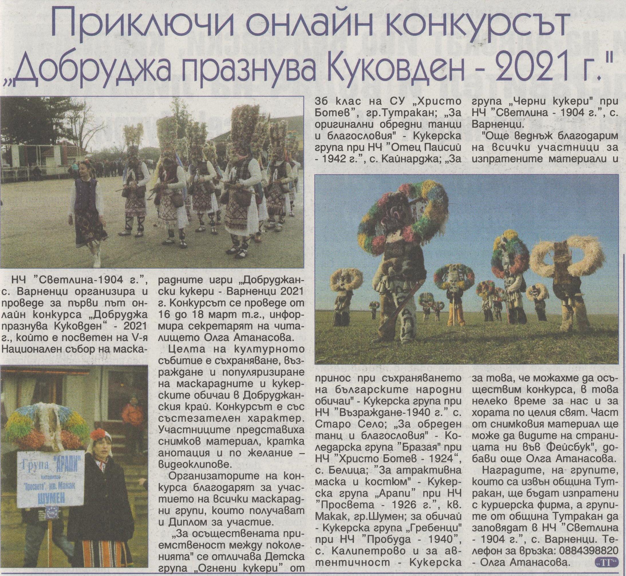 НЧ „Светлина” с. Варненци, община Тутракан, организира за първи път онлайн своя конкурс „Добруджа празнува Куковден“, посветен на V-ия Национален събор на маскарадните игри „Добруджански кукери“, провеждан в селото. Конкурсът бе в периода 16-18 март т.г., научаваме от публикация във в. Тутракански глас. Част от снимковия материал е на странцата на читалището във Фейсбук.