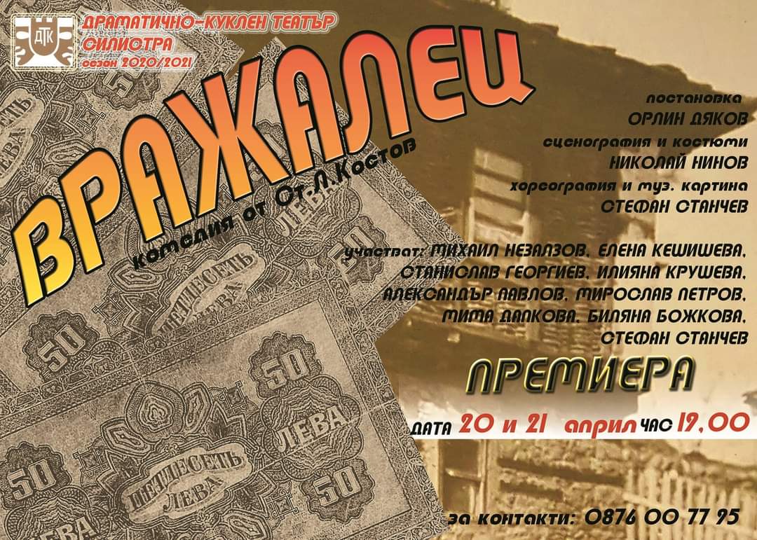 Уважаеми зрители, премиерата на комедията “Вражалец” се отлага за неопределено време поради заболяване на актьор. Моля закупилите билети да се свържат с мен на моб. 0876007795 за да уточним връщането на билетите или презаверяването им за следващата дата. Молим да бъдем извинени! За кукленото представление в събота от 11 ч. допълнително ще подадем информация за смяна на спектакъла или отмяна на програмата до края на месец април.
