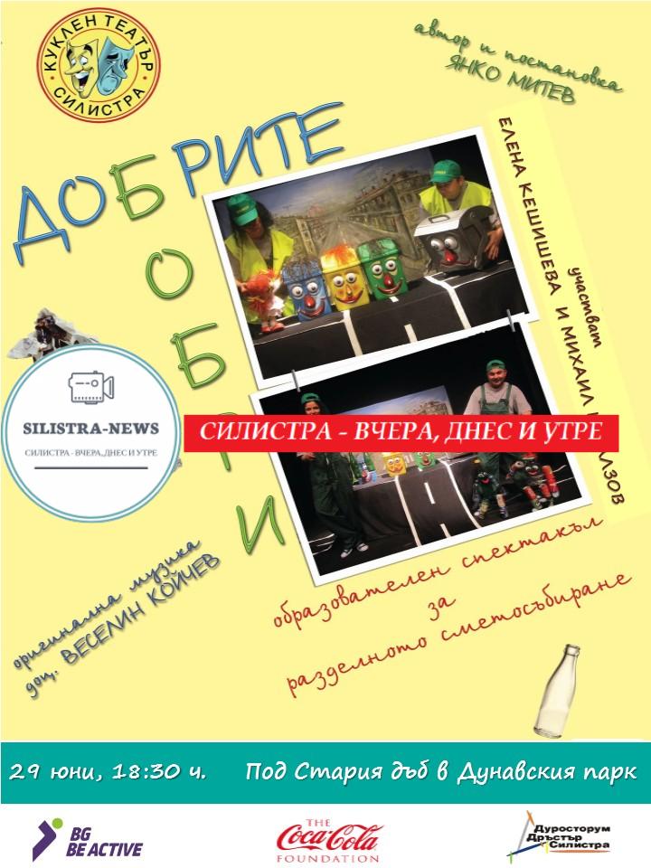 Почистването ще обхване участъка от Пристанището до Стария дъб в Дунавския парк, където от 18:30 часа за всички малки и по-големи участници ще бъде представена образователната постановка “Добрите бобри” на Драматично-куклен театър – Силистра. Целта е да бъде привлечено вниманието на най-малките към създаване на трайни навици за разделно събиране на отпадъците. Такса “Вход” за децата ще бъде 1 празна пластмасова бутилка или друг отпадък, подходящ за рециклиране, който в края на представлението ще бъде изхвърлен на правилното място.