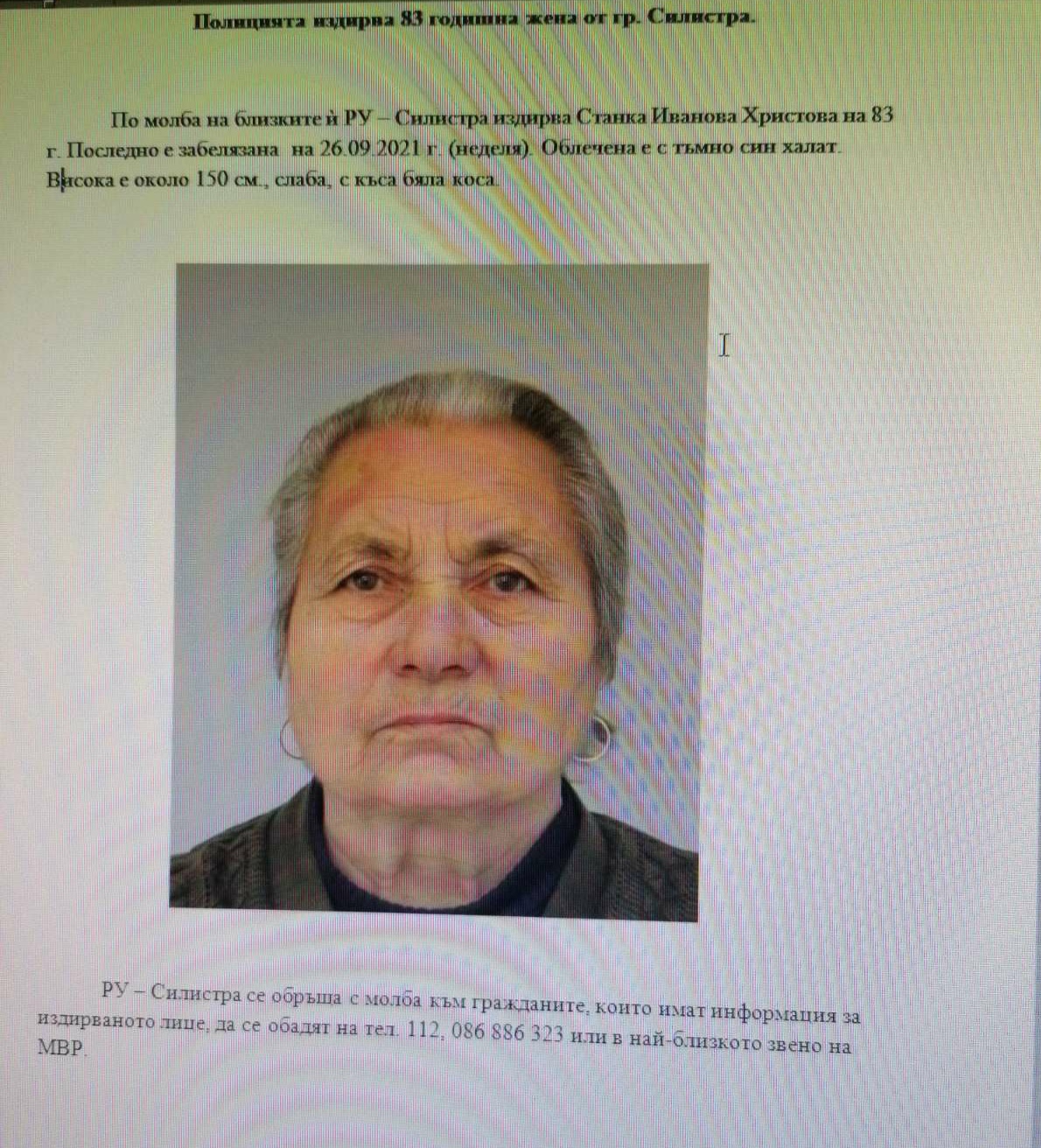 По молба на близките й, силистренската полиция издирва Станка Иванова Христова на 83 г. Последно е забелязана на 26.09.2021 г. (неделя) . Облечена е с тъмносин халат. Висока е около 150 см., слаба, с къса бяла коса.
