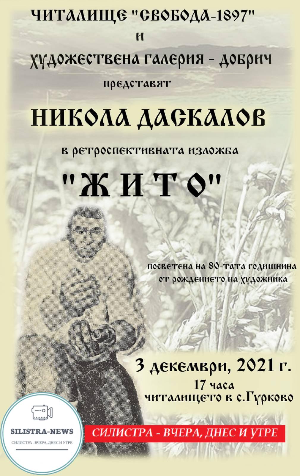„Жито“ е третата изложба от поредицата „Гурковлии, майсторлии“, която организира читалище „Свобода-1897“ в балчишкото село Гурково. Тя се открива на 3 декември в 17,00 часа и се реализира в партньорство с Художествена галерия -Добрич, за да отбележи 80-тата годишнина от рождението на един художник, свързан със селото.Добруджанският майстор на живописта Никола Г. Даскалов (1941 – 2010) е роден в с. Голеш, Силистренско. Живял и работил в с.Гурково. През 1971 г. започва работа като уредник в Художествена галерия – Добрич, а от 1975 г. до 1982 г. е неин директор.Творби на Н. Даскалов са собственост на НХГ, СГХГ, градските галерии във Варна, Плевен, Добрич, Силистра, Търговище, Стара Загора, Сливен и др., както и на частни колекционери в България, Германия, Япония, Швеция, Белгия, Ирландия.В ретроспрективната изложба, посветена на 80-тата годишнина от рождението на художника, ще представим негови платна, селектирани и предоставени от Художествена галерия -Добрич, както и архив от публикации за Н. Даскалов, събиран от майката на твореца и поверен на читалището. Творбите на Никола Даскалов, които успеем да издирим и заснемем, ще останат в постоянна виртуална изложба на видеоканала на Читалище „Свобода-1897“, съобщават от културния дом. Подготвя се и постоянна експозиция на даровитите хора на Гурково.
