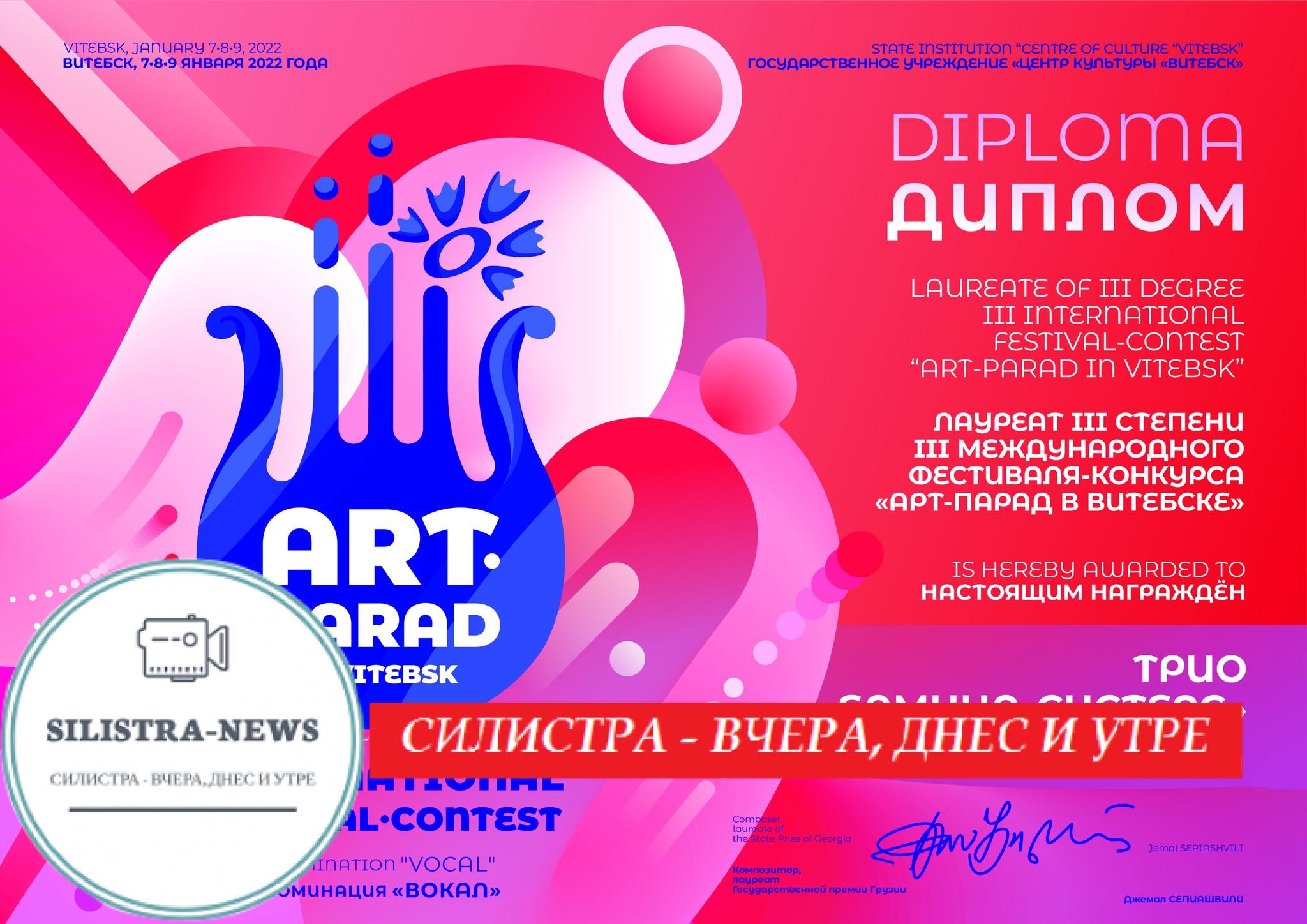 Трета награда за трио „Елмина“ от град Силистра от „Арт парад“ във Витебск, който се проведе смесено-онлайн и офлайн. Вокалната педагожка Лилия Пейчева-Тодорова, която е майка на трите момичета: „Ние се включихме онлайн сред 800 участници от 25 страни“.