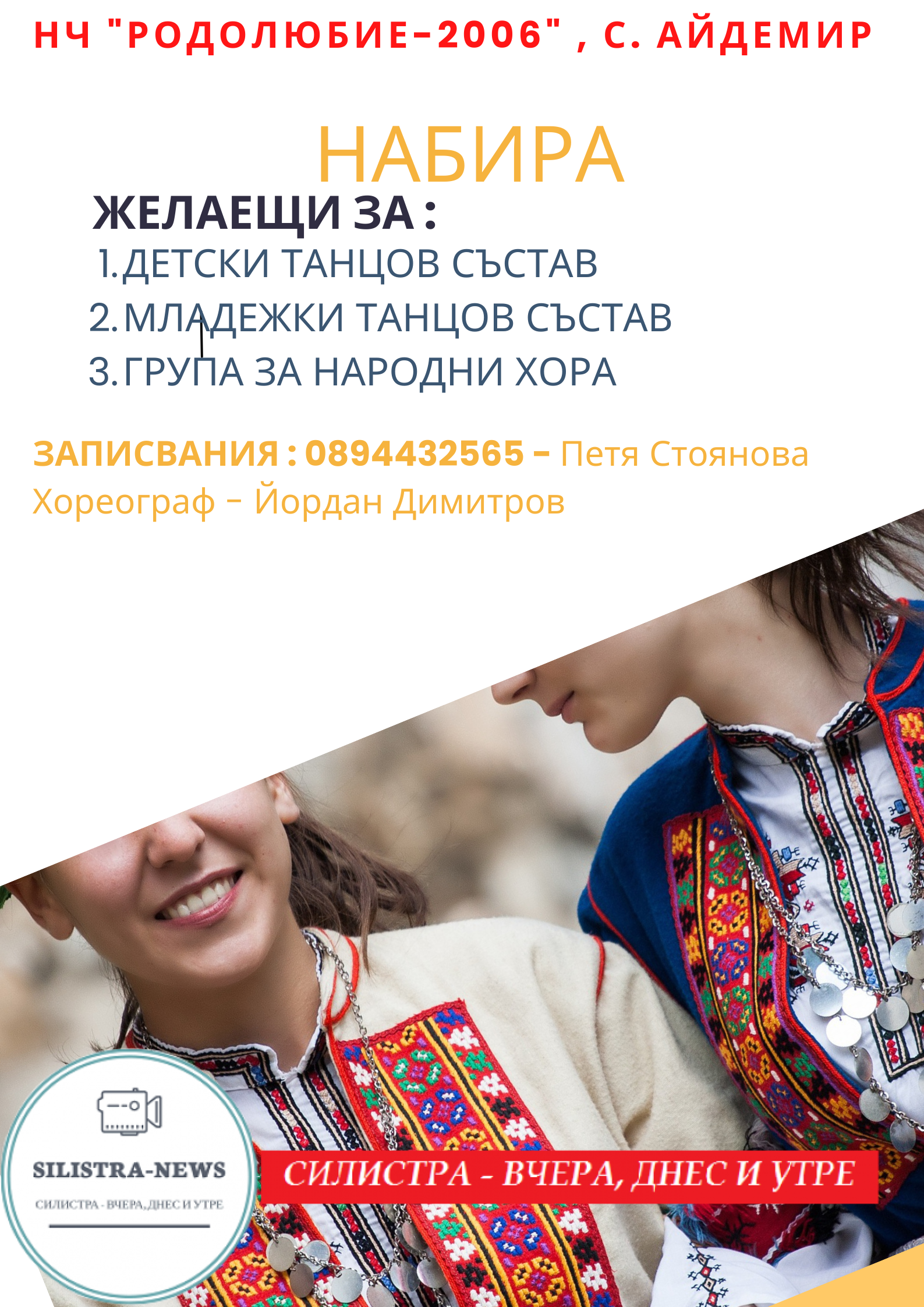 Народно читалище „Родолюбие-2006“, с. Айдемир , набира желаещи да се учат и да пазят традицията на българския народен танц. Читалището има нов хореограф, Йордан Димитров, който със своите знания и отдаденост ще допринесе за ползотворното развитие на всеки един участник в групите. Ще бъдат сформирани три групи :