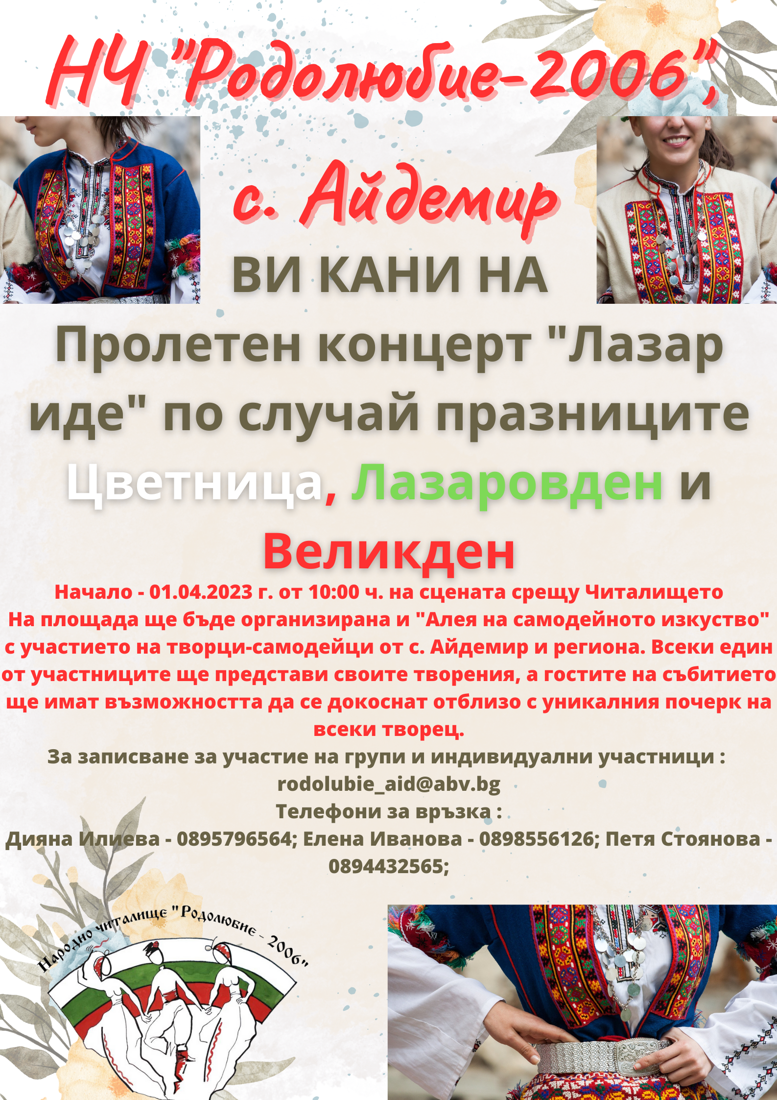 Айдемирското НЧ „Родолюбие-2006“ за поредна година ще проведе голям концерт по случай пролетните Християнски празници – Цветница, Лазаровден и Великден.