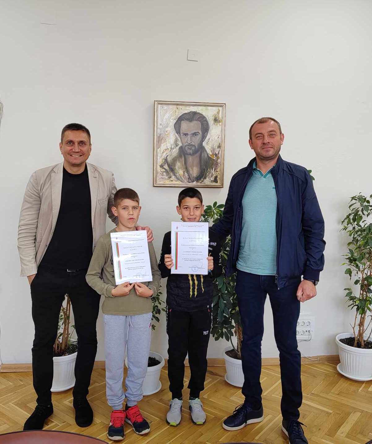 Петокласниците Пресиян Колев и Станимир Ламбев от СУ „Н.Й.Вапцаров“ в Силистра получиха днес благодарствени адреси от полицията за достойна постъпка. Началникът на Районното управление главен инспектор Траян Петров лично посети училището, за да поздрави и похвали децата за проявеното благородство.