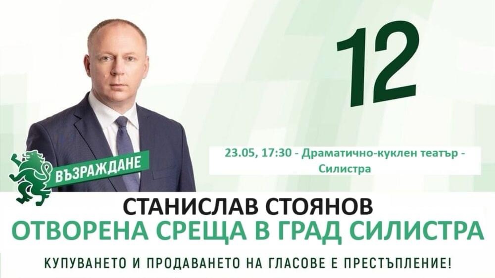 Гражданите на Силистра може да задават всякакви въпроси, които ги интересуват от национално и европейско ниво днес /23.05/ на отворена среща от 17:30 часа в Драматично-кукления театър в града. В дискусията ще участват кандидатите за Евродепутати от „Възраждане“ Станислав Стоянов и Георги Джендов, както и кандидатът за народен представител и координатор на област Силистра Маргарита Генчева.