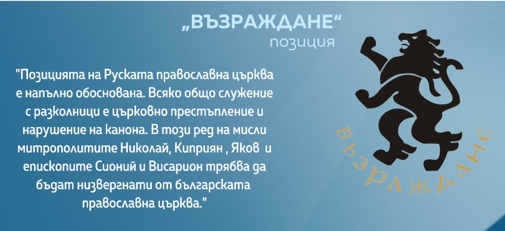 „Руската патриаршия реши да прекрати общението с петима български архиереи (трима митрополити и двама епископи) заради тяхната обща служба с украински разколници в Цариград. Официалната позиция на „Възраждане“ по този повод е, че тези митрополити и епископи трябва да бъдат низвергнати заради нарушаването на църковните закони и опита им да унищожат независимата българска църква, подчинявайки я на фанариотите от Вселенската патриаршия.“, написа Костадинов в профила си в социалната мрежа Фейсбук.