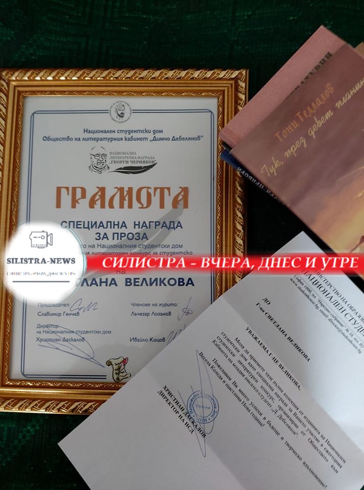 Националният конкурс за студенти „Георги Черняков“ е организиран от Национален студентски дом. Участие в него вземат студенти от български университети, както и такива от цял свят. Конкурсът е за проза и поезия. Светлана Великова печели специалната награда със своя разказ „Дядо Петко“ (очаквайте повече информация за разказа скоро). Повечето от останалите наградени не са от университети в България, но ето, че нашето момиче се преборва успешно със сериозната конкуренция и е удостоена с престижната награда.