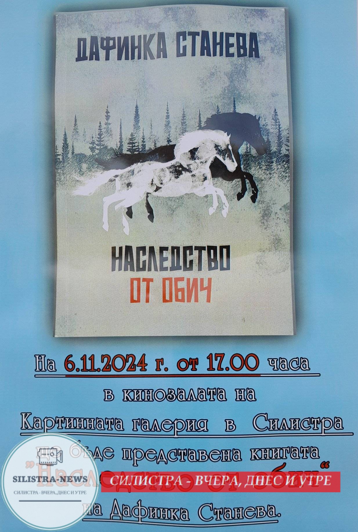 На 6.11.2024 г. от 17.00 часа в концертната зала на Художествена галерия – Силистра ще бъде представена книгата с разкази „Наследство от обич“ с автор Дафинка Станева. Тя е автор на пет стихосбирки, писател и краевед с 6 тематични творби, преводач на творци от Русия, Украйна и Беларус, както и дългогодишен общественик в община Кайнарджа – в миналото е била председател на Общинския съвет и зам.-кмет на общината.