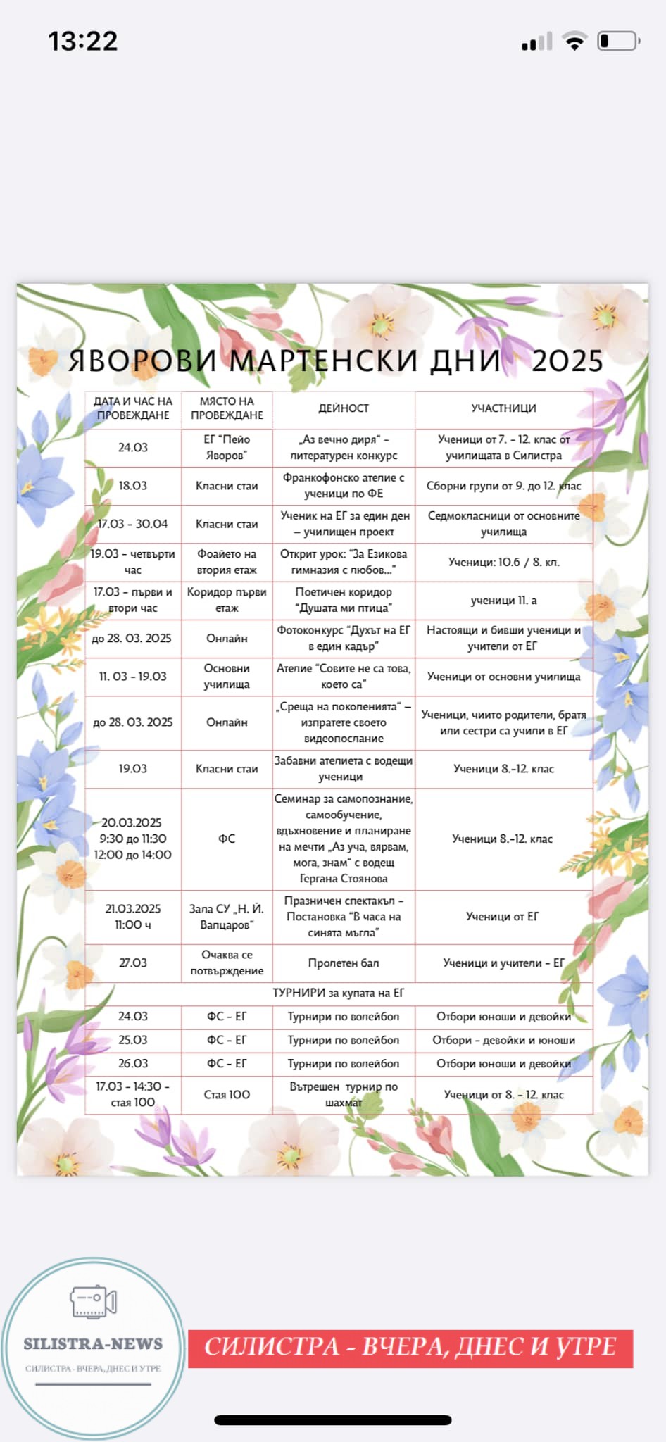 Езикова гимназия обявява началото на Яворовите мартенски дни. Езикова гимназия празнува своя 35-годишен рожден ден. В рамките на целия месец с различни събития училището ще ,,разкаже” защо нейният празник е пролетта. Защо ЕГ е белият цвят на цъфналата вишна, зелената клонка на надеждата, корените на миналото и вейките на бъдещето. Първият ден на пролетта е празникът на гимназията. Тогава ще е кулминацията на тържествата – спектакълът “В часа на синята мъгла” , режисиран от актрисата Тезджан Ферад, която ръководи Клуба за артистично майсторство в училището. А в съпътстващите празника инициативи ще се включат колективът на ЕГ, бивши ученици , бивши и настоящи родители..
